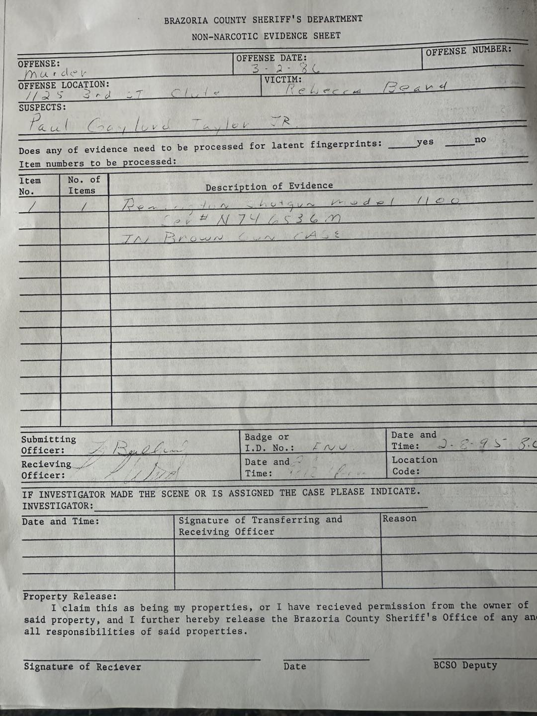 “On Tuesday, July 22, 2025, I was reviewing court paperwork and found an Evidence Sheet from the Brazoria County Sheriff’s Department. The weapon was logged into evidence at 8:05 a.m. on February 8, 1995 — a Remington 1100 shotgun.