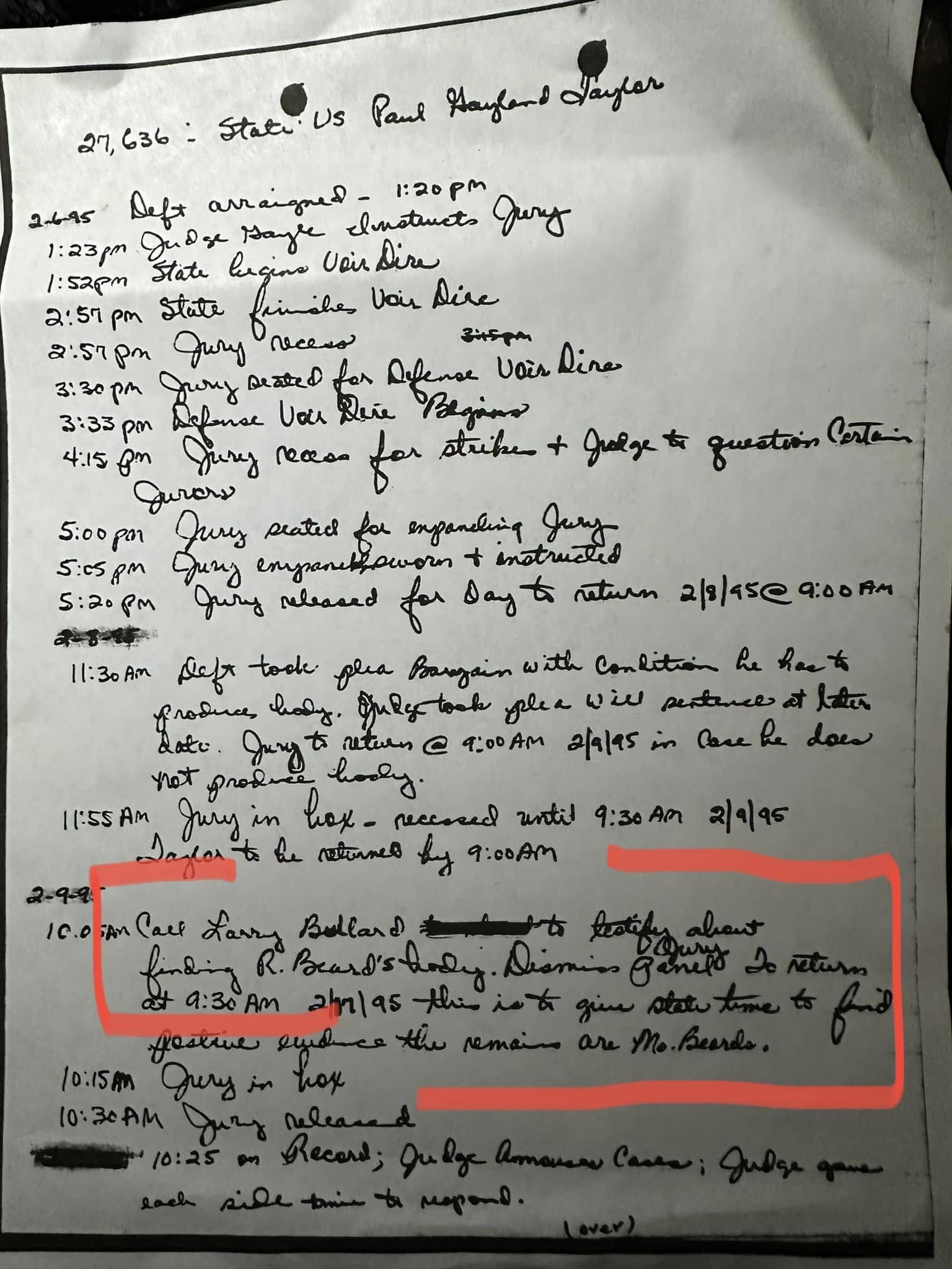 “2-9-95, 10 a.m. – Larry Bullard to testify about finding R. Beard’s body. Jury dismissed until 2-17-1995, 9:30 a.m. This is to give the state time to find positive evidence the remains are Ms. Beard’s.”