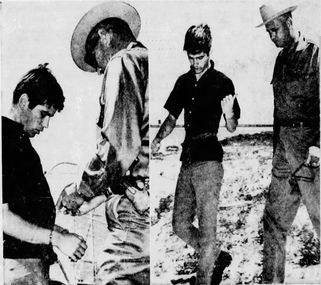 The California, Beatnik-ish, counter-culture look and clothes got John Angles arrested in Kerrville, Texas. Within minutes, the officer realized Angles saying more gibberish than sensible words—and he discovered the boy was carrying a .38 pistol. He took Angles into custody.