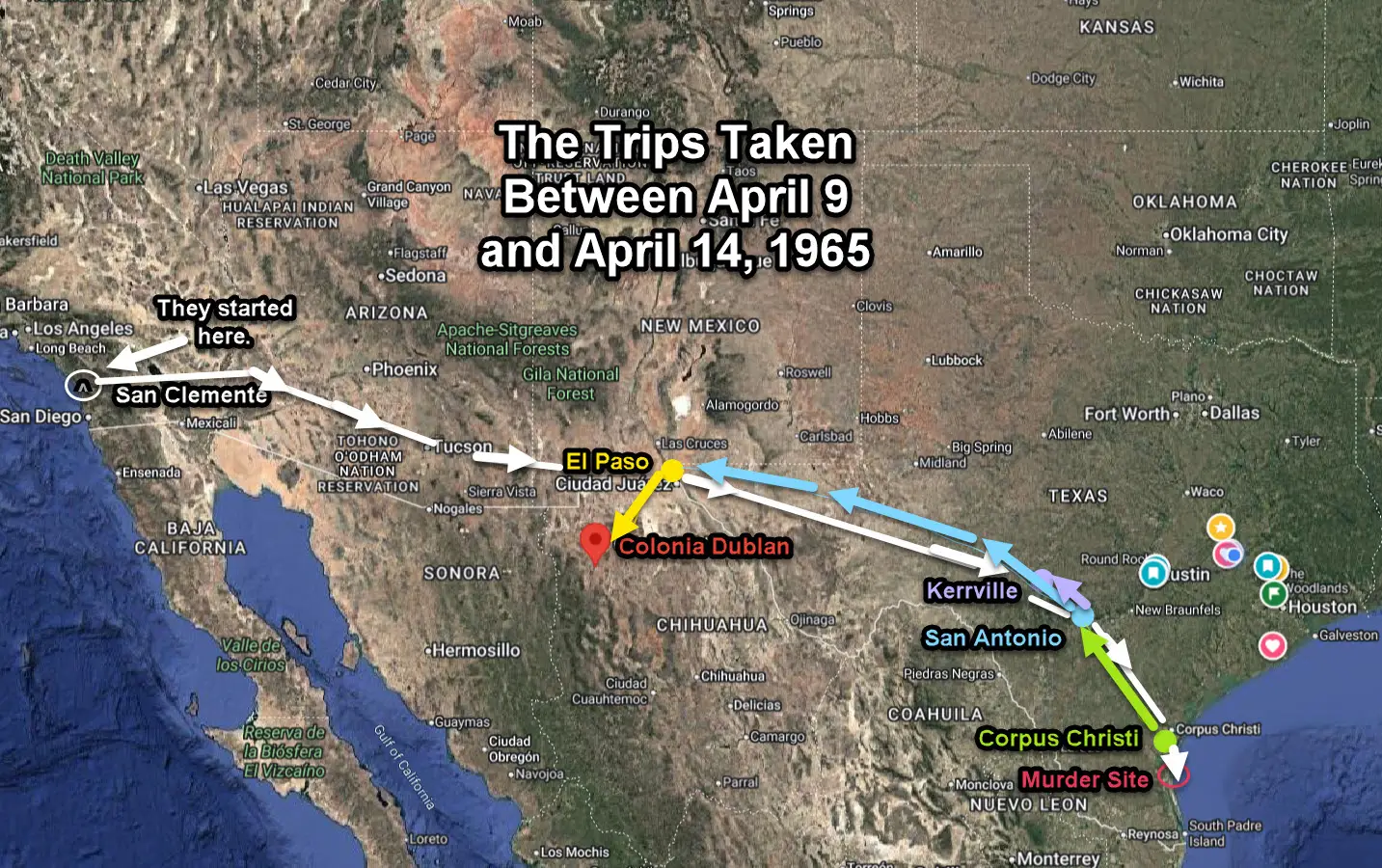 In San Antonio, they rented a motel room under fake names. Their plan was to split up and ditch the car, making it look as if they had disappeared. Krueger wanted to get into Mexico and thought they would be better off alone and on foot, presumably because of having rented the boat that they had not turned in, which could have also identified them in some way as a pair of teens heading toward the site where the dead bodies would be found floating.