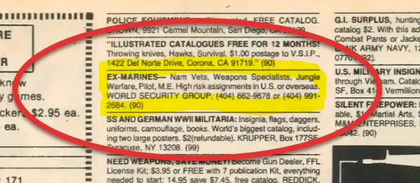 When his local contacts proved unwilling, Bob Black cast a wider net. In October 1984, his search led him to the classifieds of Soldier of Fortune magazine, where he found an ad for the World Security Group.